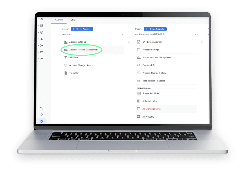 a. Click on the gear symbol in the bottom left corner of your Analytics account to view the Admin settings.