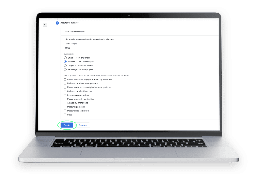 5. About Your Business: Fill out your business details. Click CREATE. Accept Google Analytics Terms of Service Agreement.