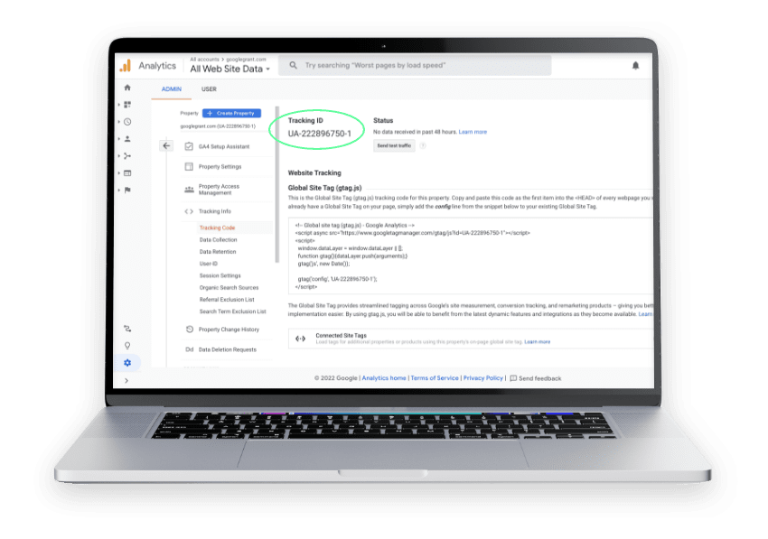 2. On this page you will see your Tracking ID and a snippet of code that will need to be placed into the backend of your website. The next step is going to depend on your website’s platform (Squarespace, WordPress, Wix, etc.). We have compiled a list of support links that can help you properly embed this code into your website. If you don’t see a link to your website provider, please contact them directly to learn more about how they connect to GoogleAnalytics.
