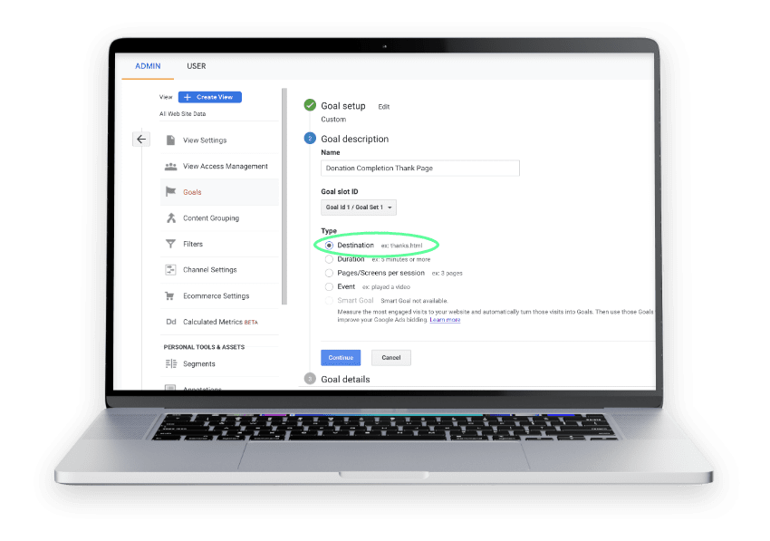 Watch an in-depth video on Google Analytics goals HERE, or click HERE for some brief insight on what makes a good goal. The best destination goals require a user to do something before making it to the destination URL. Examples include: a final confirmation page to a donation, or a “thank you” page after a newsletter